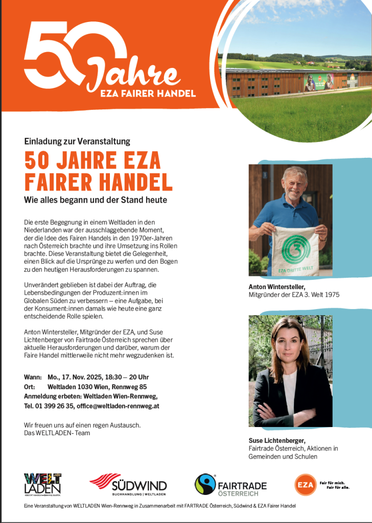 Am 17.11. fand im Weltladen am Rennweg ein kleiner, feiner, sehr informativer Abend zum Thema 50 Jahre EZA statt. Anton Wintersteller, EZA Pionier der ersten Stunde, erzählte von den Anfängen, den Ideen, den Schwierigkeiten und letztlich der Erfolgsgeschichte von EZA. Im Anschluss daran durfte ich einen kleinen Vortrag halten, in dem ich über die Arbeit von FAIRTRADE, Frauenprojekte in Afrika und über die engagierte und couragierte Arbeit der FAIRTRADE-Gemeinden und -Schulen berichten konnte. Im Anschluss gab es anregende und interessante Gespräche mit Gästen und Weltladenengagierten.