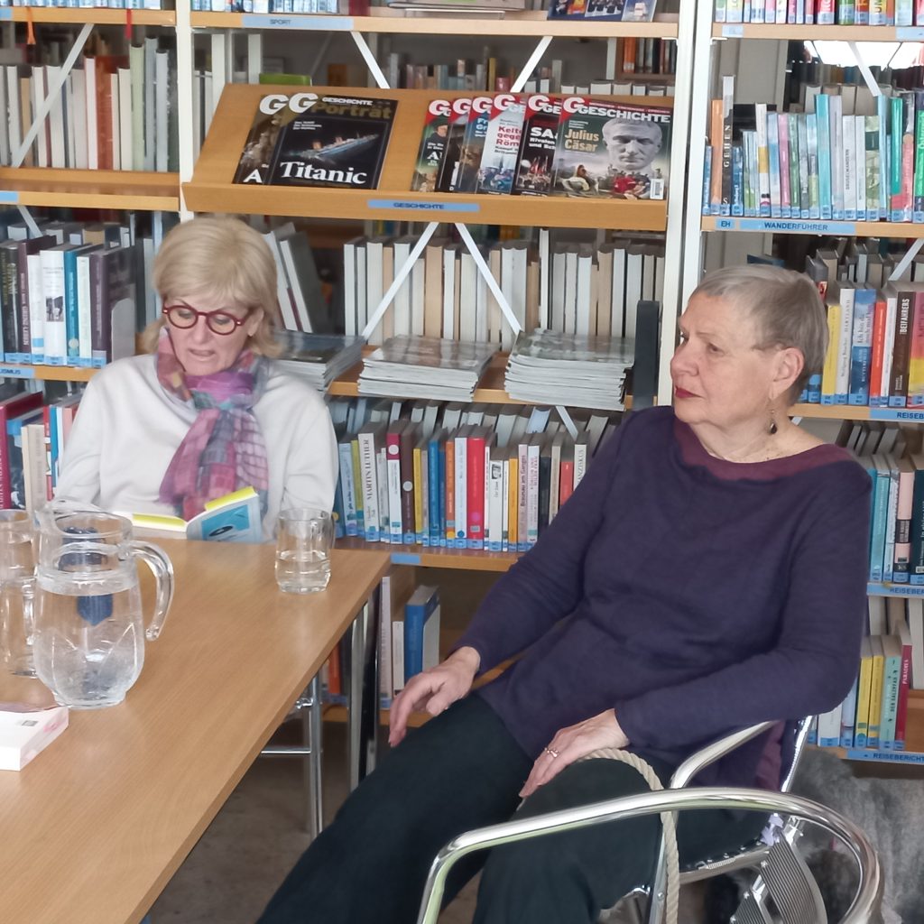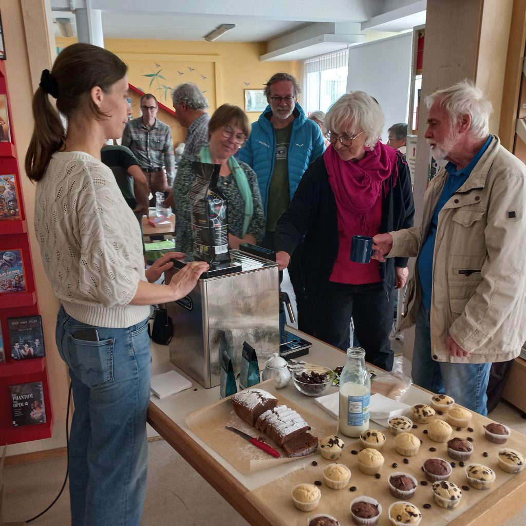 Zunächst luden wir alle LiebhaberInnen des schwarzen Heißgetränks zu einem nachmittäglichen Kaffeekränzchen in die Bibliothek ein. Die „Fairtrade-Frauen“ rund um Susanne Nobis brachten köstlichen, fair gehandelten „Adelante“-Kaffee – ein schicker Vollautomat wurde uns freundlicherweise von der EZA zur Verfügung gestellt – und es wurden Geschichten aus Büchern zum Thema Kaffee vorgelesen. Vom gefährlichsten Kaffee der Welt, dem caffè sospeso aus Neapel bis zu poetischen Kaffee- und Sprachspielereien war alles dabei.