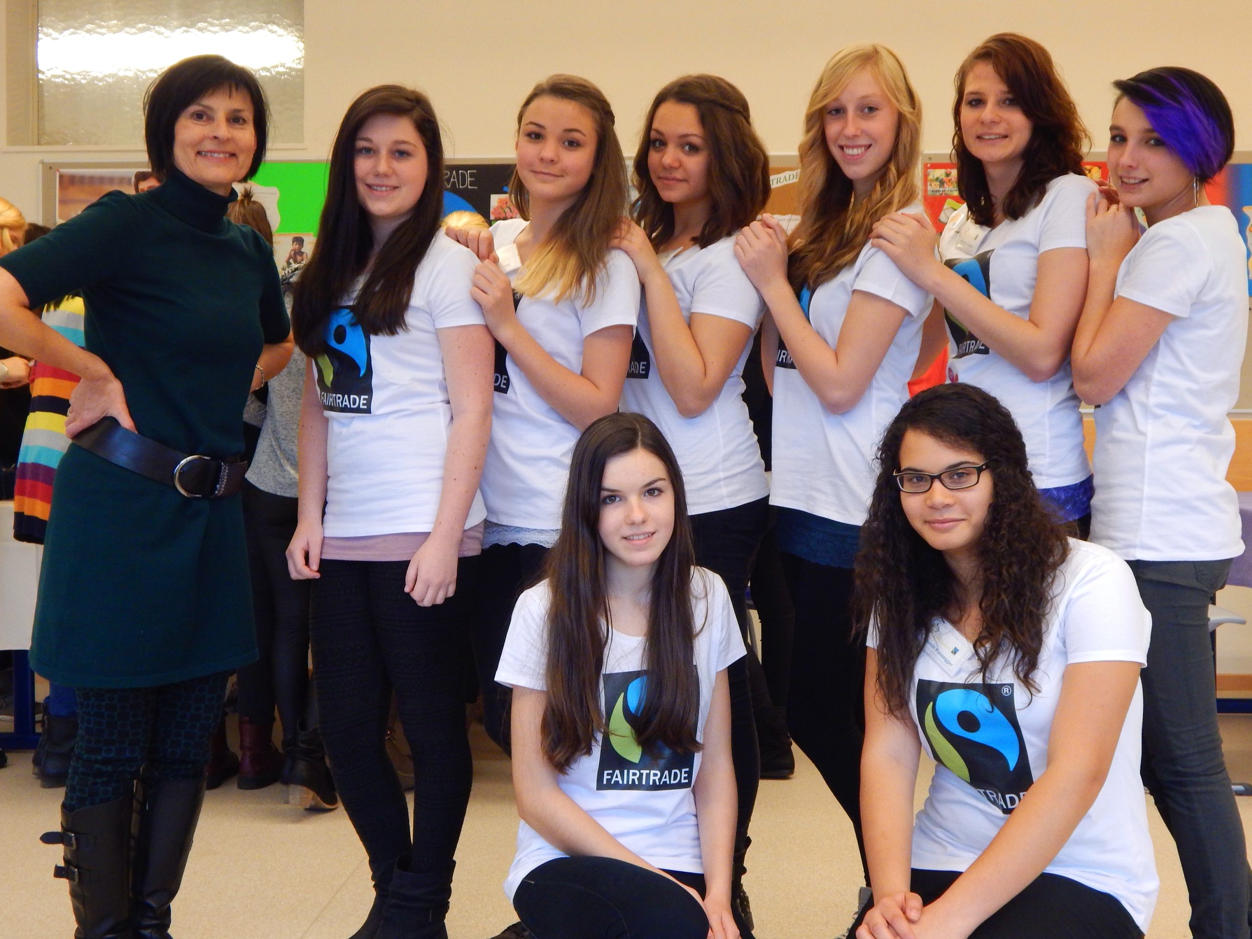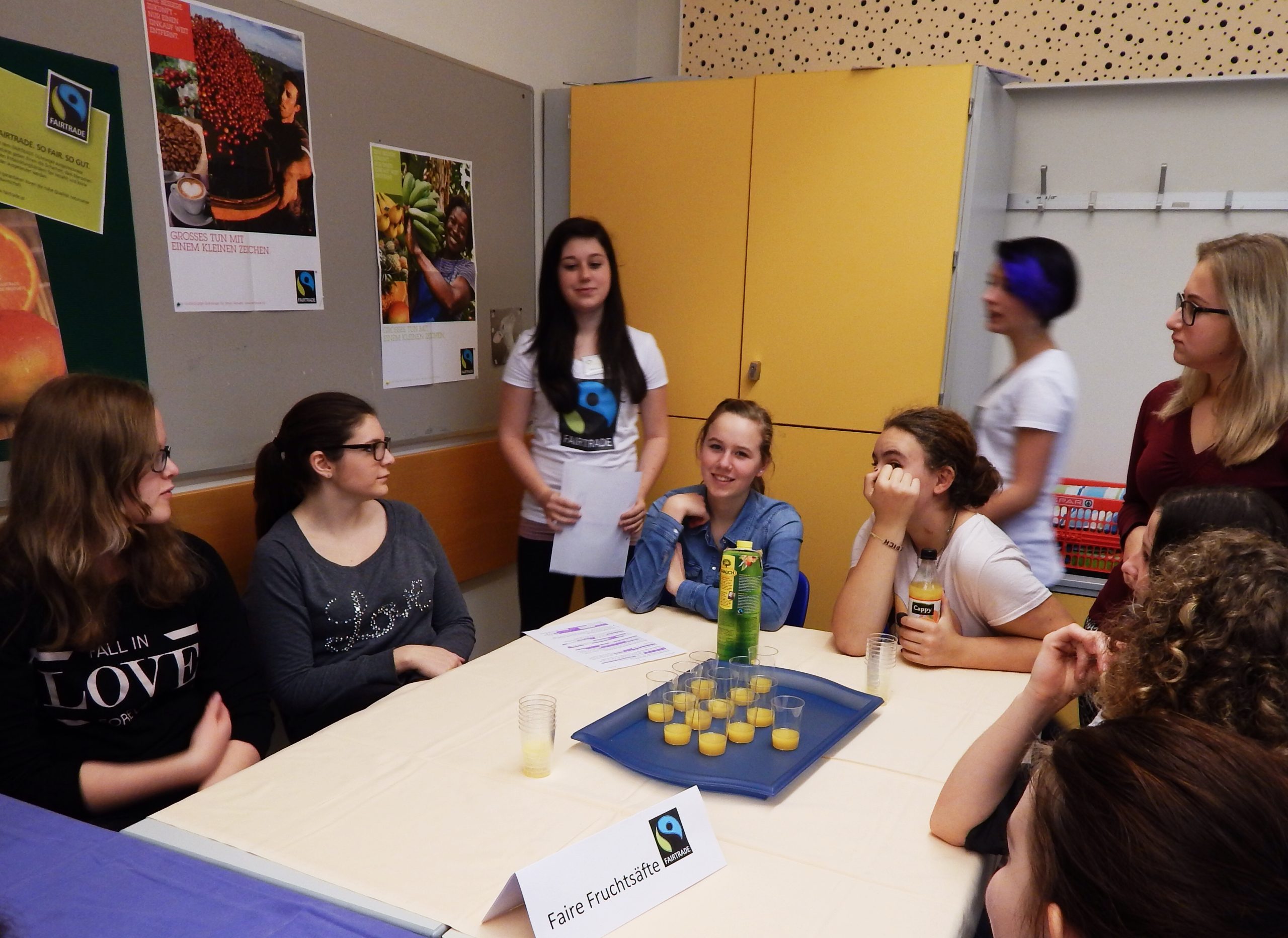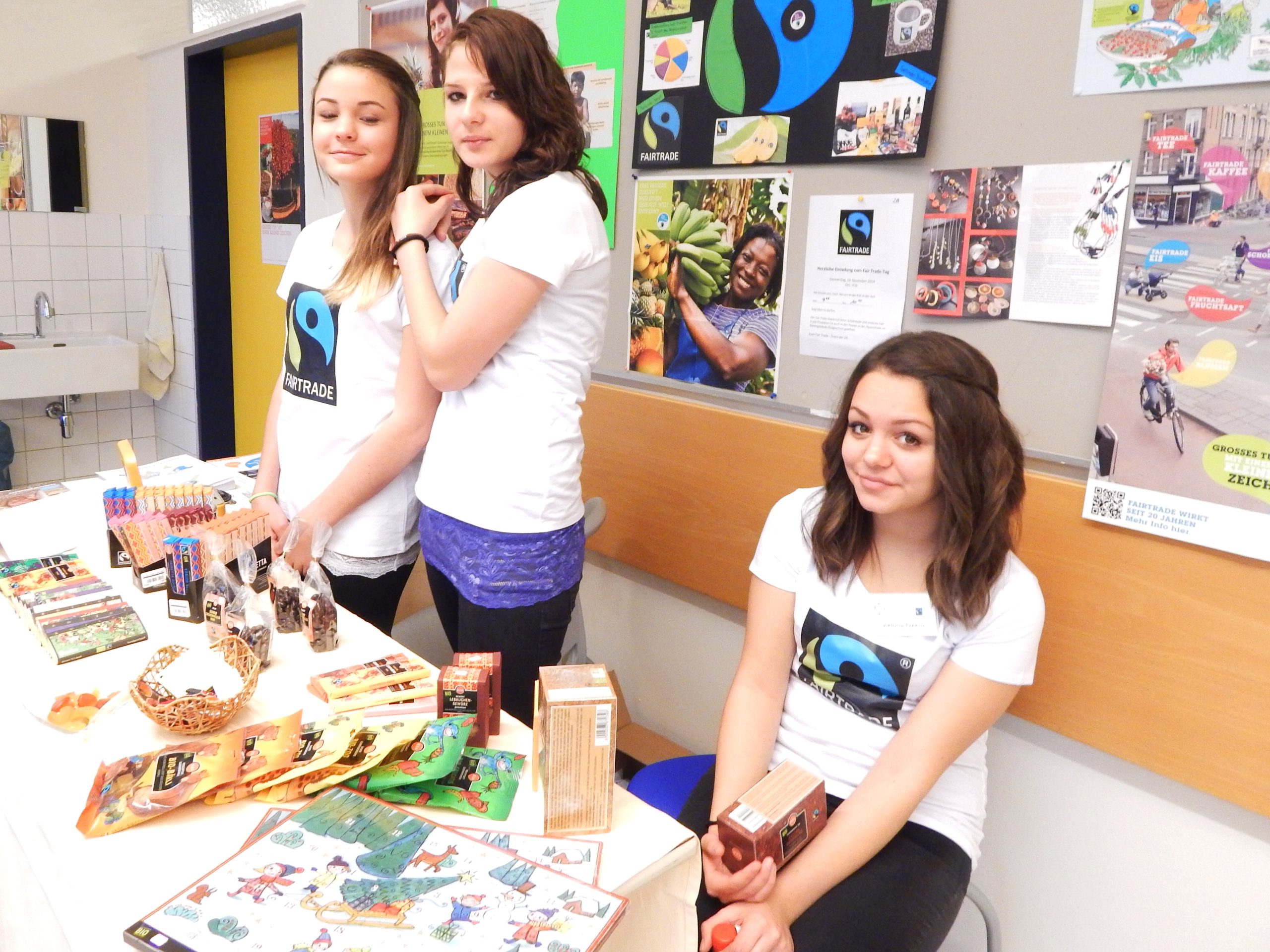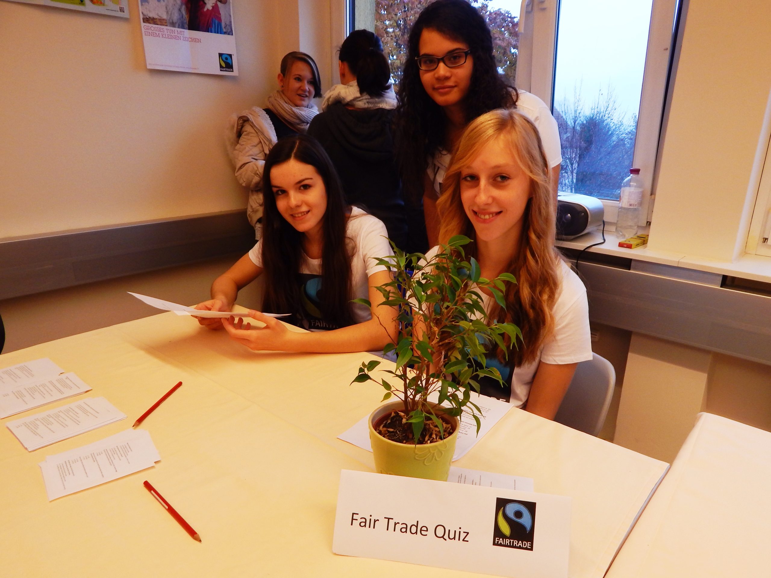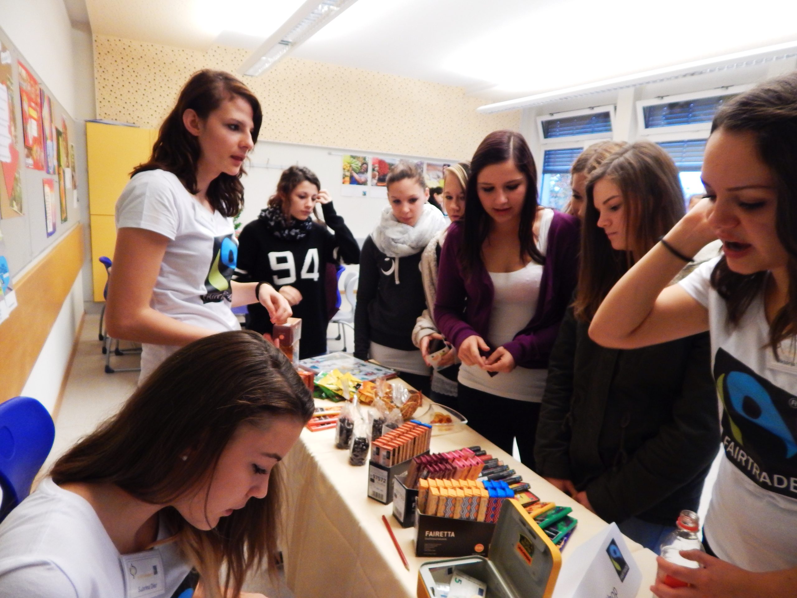 Am 13. November 2014 stand die HLW Fohnsdorf ganz im Zeichen von Fair Trade. Die Fair Trade- Gruppe der 2A gestaltete für alle Schülerinnen und LehrerInnen der Schule einen Informationstag  zu diesem Thema. Der Elternverein unterstützte diese Aktion und stellte dankenswerterweise T-Shirts mit dem Fair-Trade-Logo für die Schülerinnen bereit. In den Wochen davor hatten  schon einige Vorbereitungsarbeiten stattgefunden  und so konnte die Aktionsgruppe in dem sehr schön gestalteten Klassenraum  ihre BesucherInnen mit  einer informativen Präsentation begrüßen. Danach wurden die Gäste eingeladen, die Unterschiede zwischen fair gehandeltem und herkömmlichen Fruchtsaft kennenzulernen und dabei  auch „faire Säfte“ zu verkosten. Wer Lust hatte, konnte bei einem Quiz auch sein Wissen über Fair Trade unter Beweis stellen. Schließlich nutzten viele  „Süßschnäbel“ die Möglichkeit, im Fair Trade Shop(an zwei Standorten)  Schokolade und andere Süßigkeiten zu kaufen. Diese wurden zuvor vom Weltladen Judenburg mitgenommen und ca. 70% der Waren wurden verkauft!