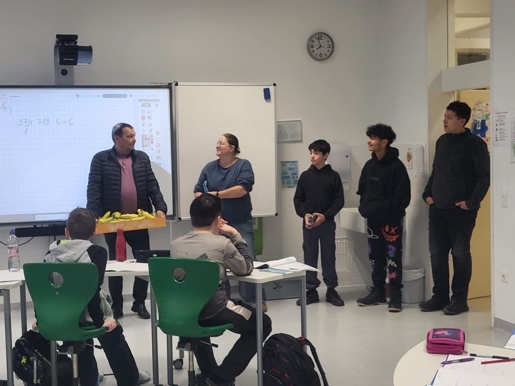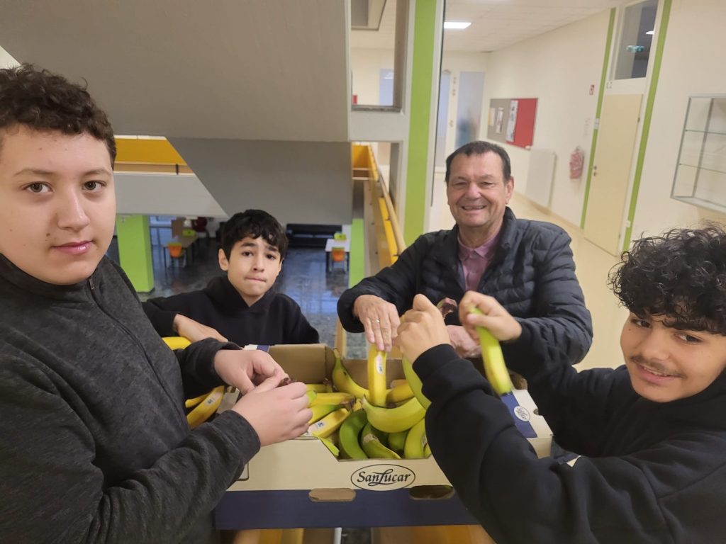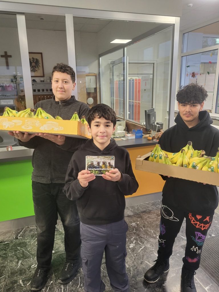 Nachdem im Unterricht Anbau und Lieferkette von Bananen besprochen wurden, verteilten die Schüler:innen – gemeinsam mit dem FAIRTRADE-Beauftragten der Gemeinde und der Geschäftsführerin des Weltladens Pinkafeld – FAIRTRADE-Bananen an alle Schüler:innen der Mittelschule Pinkafeld und informierten gleichzeitig über die Bedeutung eines verantwortungsvollen Konsums.