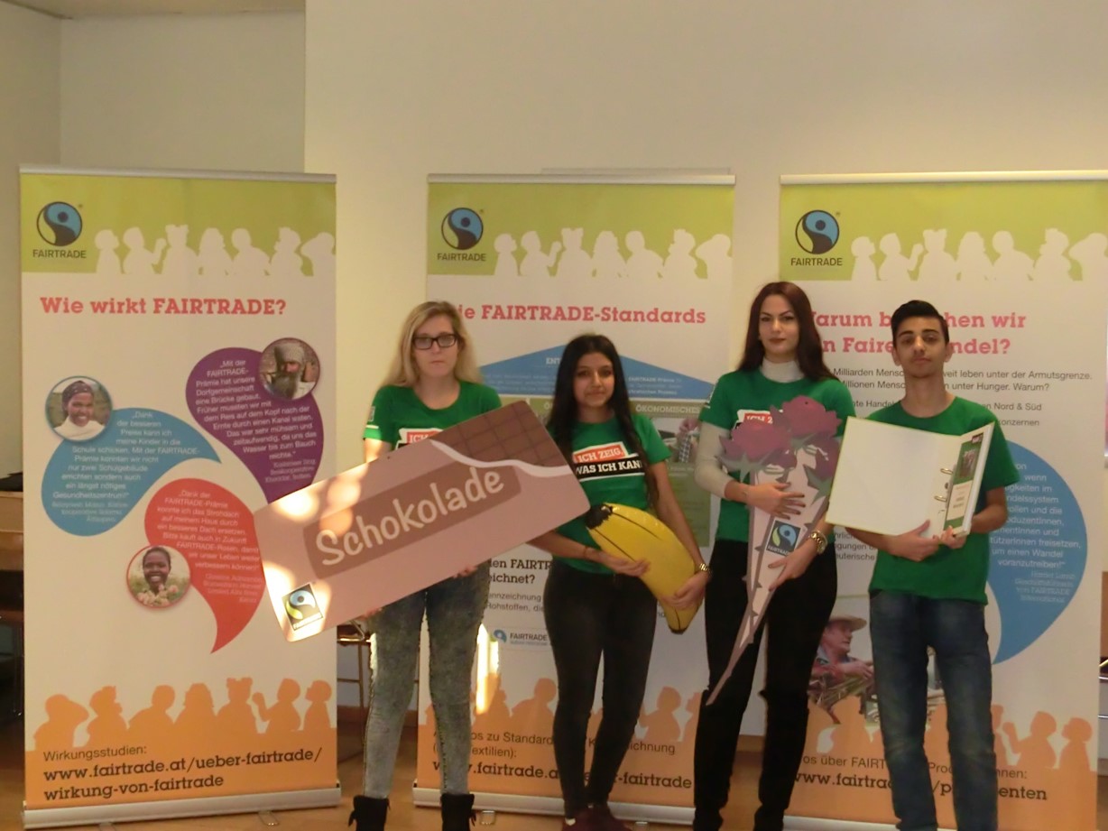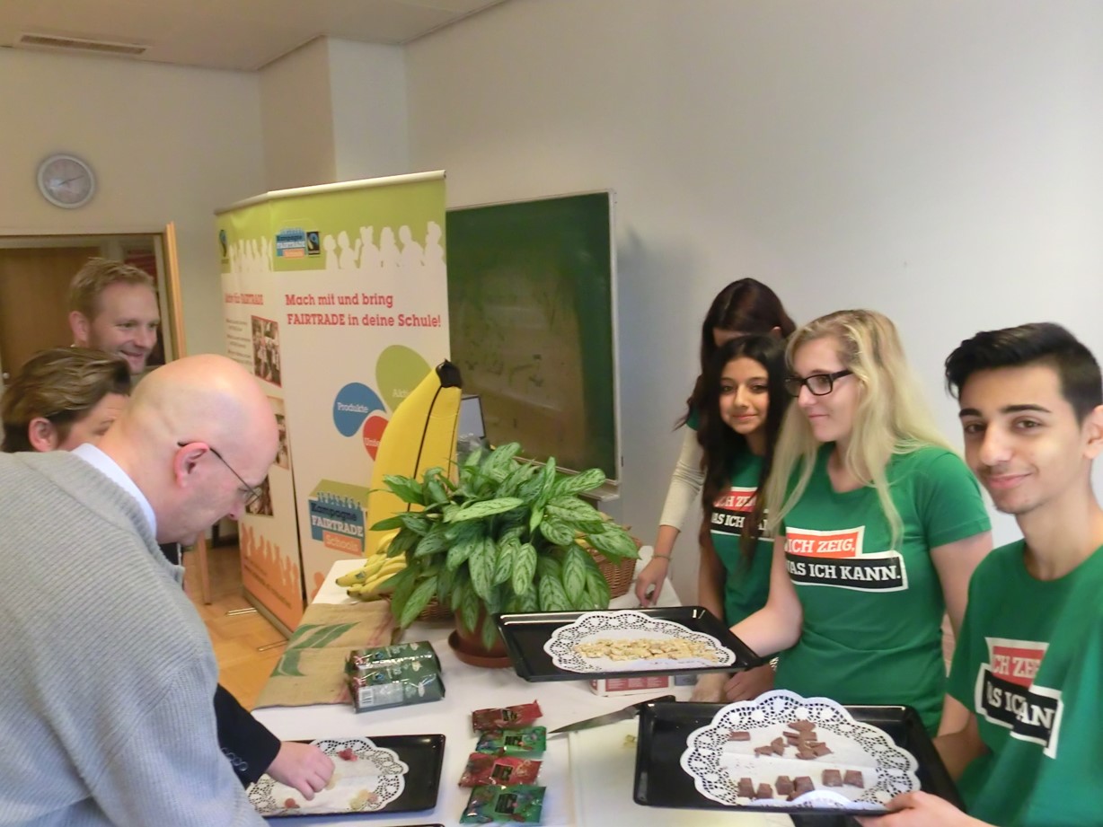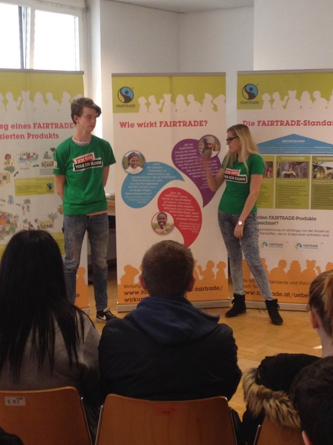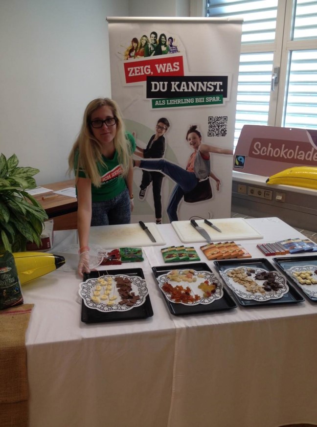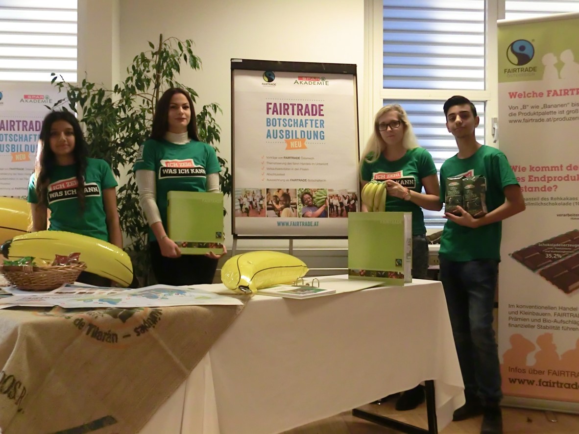 Inhalte der Ausbildung wurden ebenso näher gebracht wie eine Präsentation zum Thema FAIRTRADE anhand einer Wanderausstellung. Zum Abschluss der Station konnten die interessierten Schüler noch FAIRTRADE Produkte wie Bananen, Schokolade und Säfte verkosten.