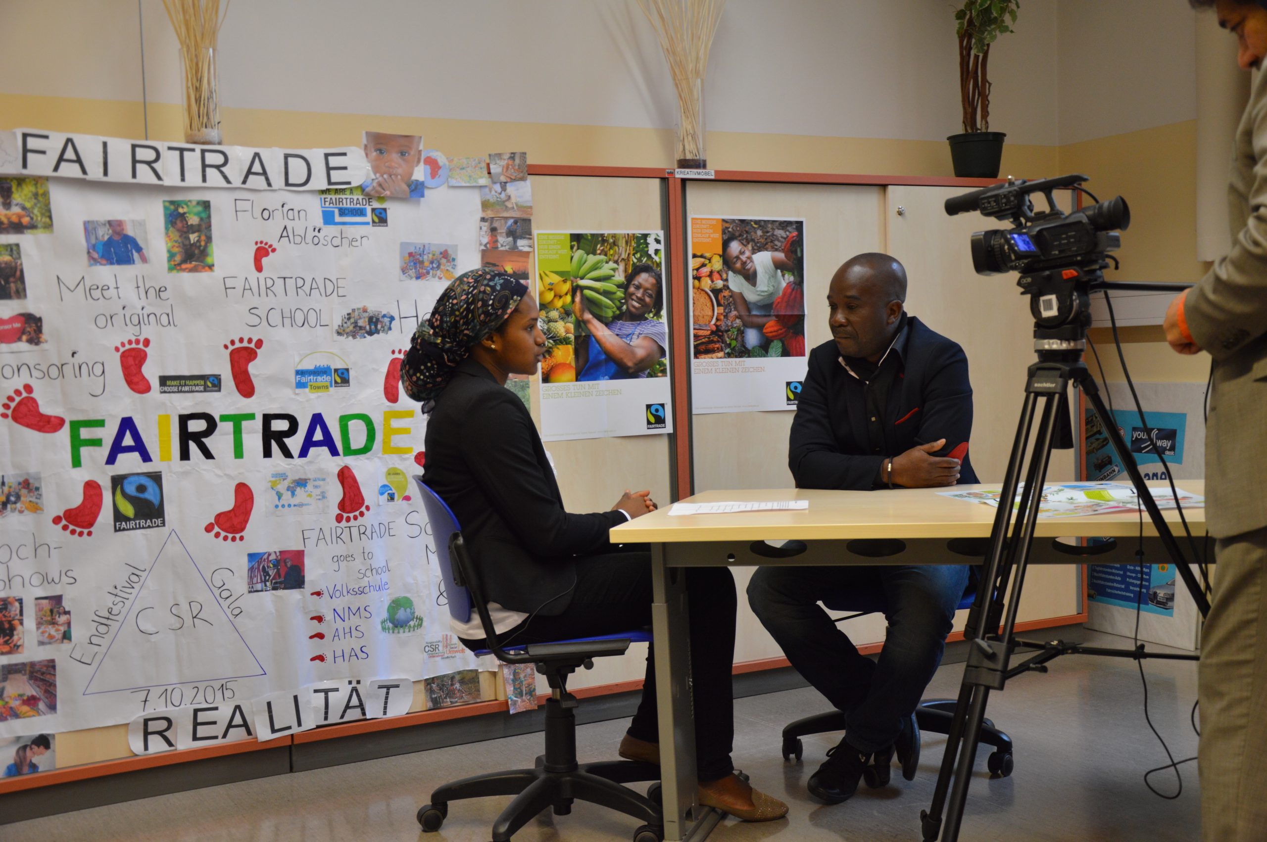 Frau Kollmann, Verein FAIRTRADE Österreich, hat uns gesagt, dass in nächster Zeit ein Vertreter der FAIRTRADE-Bauern aus der Elfenbeinküste in Wien sein wird. Wir nutzten diese Gelegenheit und fragten, ob wir mit diesem Bauern ein Interview führen können. Nach der Zusage wurde sofort ein Interviewleitfaden erstellt und ein Kamerateam organisiert. Mr. Fortin Bley erzählte uns Vieles über die Bedeutung von FAIRTRADE in seinem Heimatland. Mr. Bley zeigte uns ein paar Bilder auf seinem Laptop, über die Arbeit eines FAIRTRADE-Bauers und erklärte uns Einiges dazu. Ein sehr interessantes Interview, welches viele Informationen über FAIRTRADE lieferte.