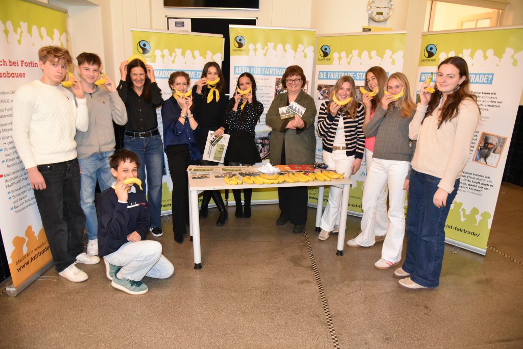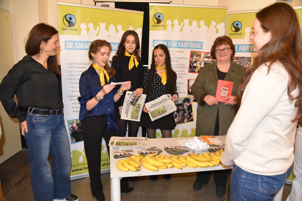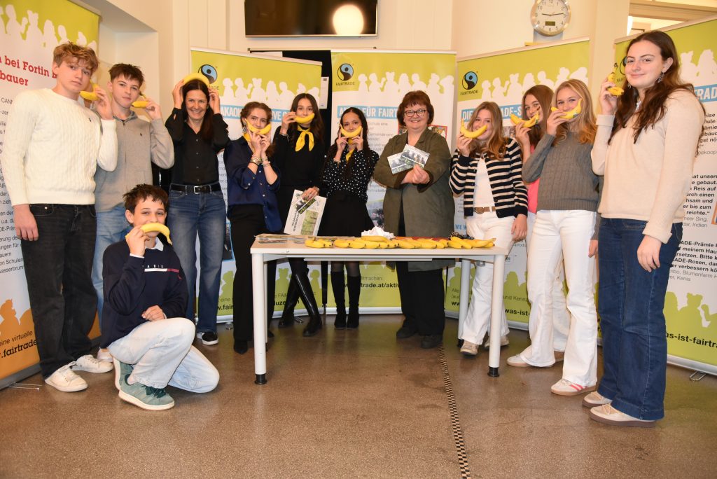 Etwa zwölf Kilo Bananen werden in Österreich pro Haushalt jedes Jahr gegessen und jede vierte davon ist FAIRTRADE-zertifiziert. FAIRTRADE-Bananen schaffen Perspektiven für Kleinbauernfamilien, da sie für stabilere Einkommen durch den FAIRTRADE-Mindestpreis und die -Prämien sorgen. Daher setzen wir als FAIRTRADE-Schule aktiv ein Zeichen für Menschenrechte entlang der gesamten Lieferkette.