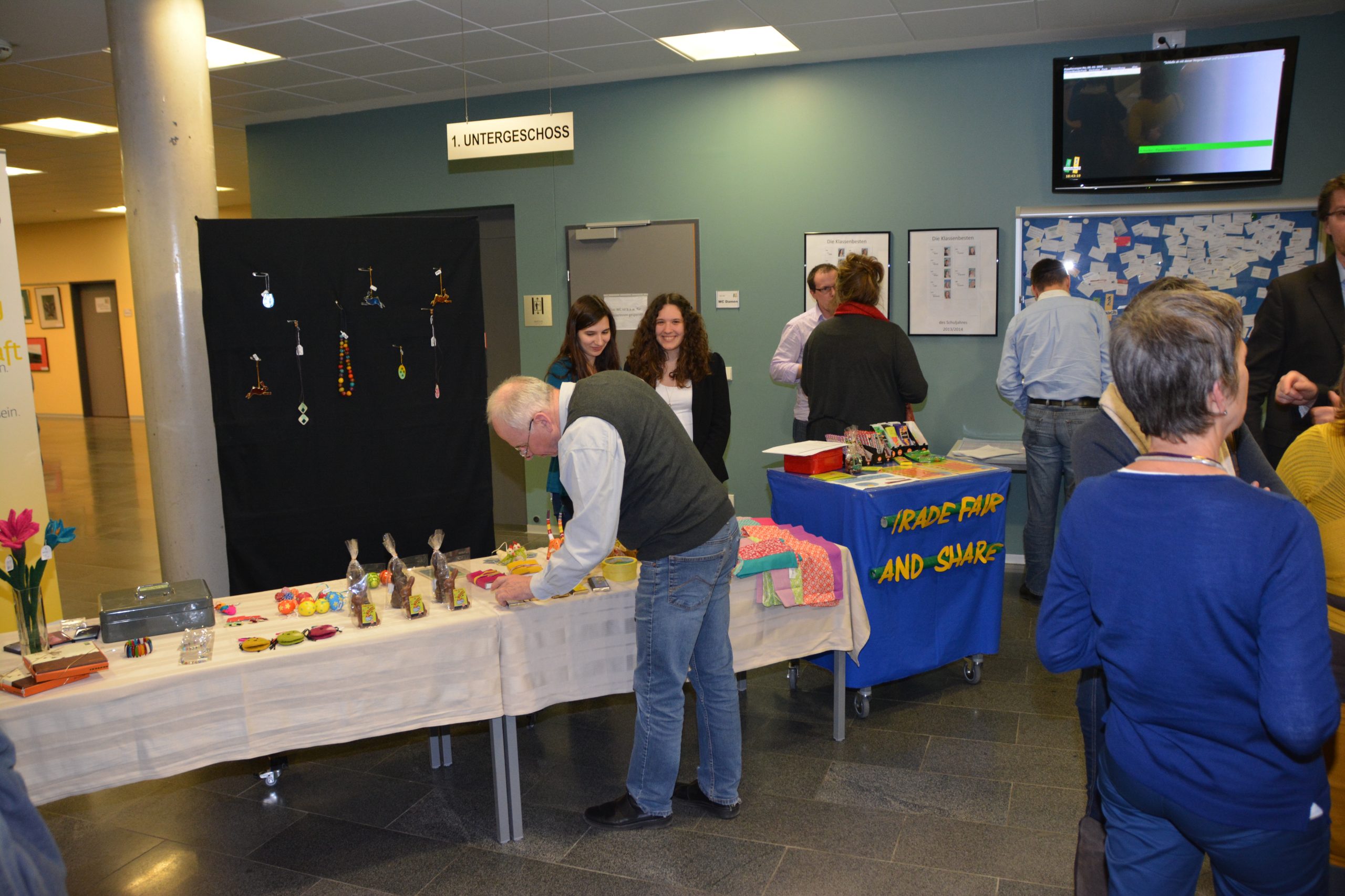 Im Rahmen der beiden Veranstaltungen Direkte Demokratie und DigBiz Projektpräsentationen hat unser School-Team Trade Fair And Share allerlei Fairtrade Produkte zum Thema „Ostern“ angeboten. Unter den Artikeln befanden sich Schmuck, Dekorationsartikel, Smartphone-Hüllen, Schokohasen, Schals und vieles mehr. Wir konnten viele Besucher an unseren Stand locken und beobachteten mit Freude, dass die liebevoll gearbeiteten Produkte großes Interesse weckten. Ein Umsatz von 180 € bestätigte diesen Eindruck. Neben diesem Stand haben wir auch wieder ein Buffet betrieben, bei welchen wir die Gäste mit Säften und Kaffee von Fairtrade bewirteten.