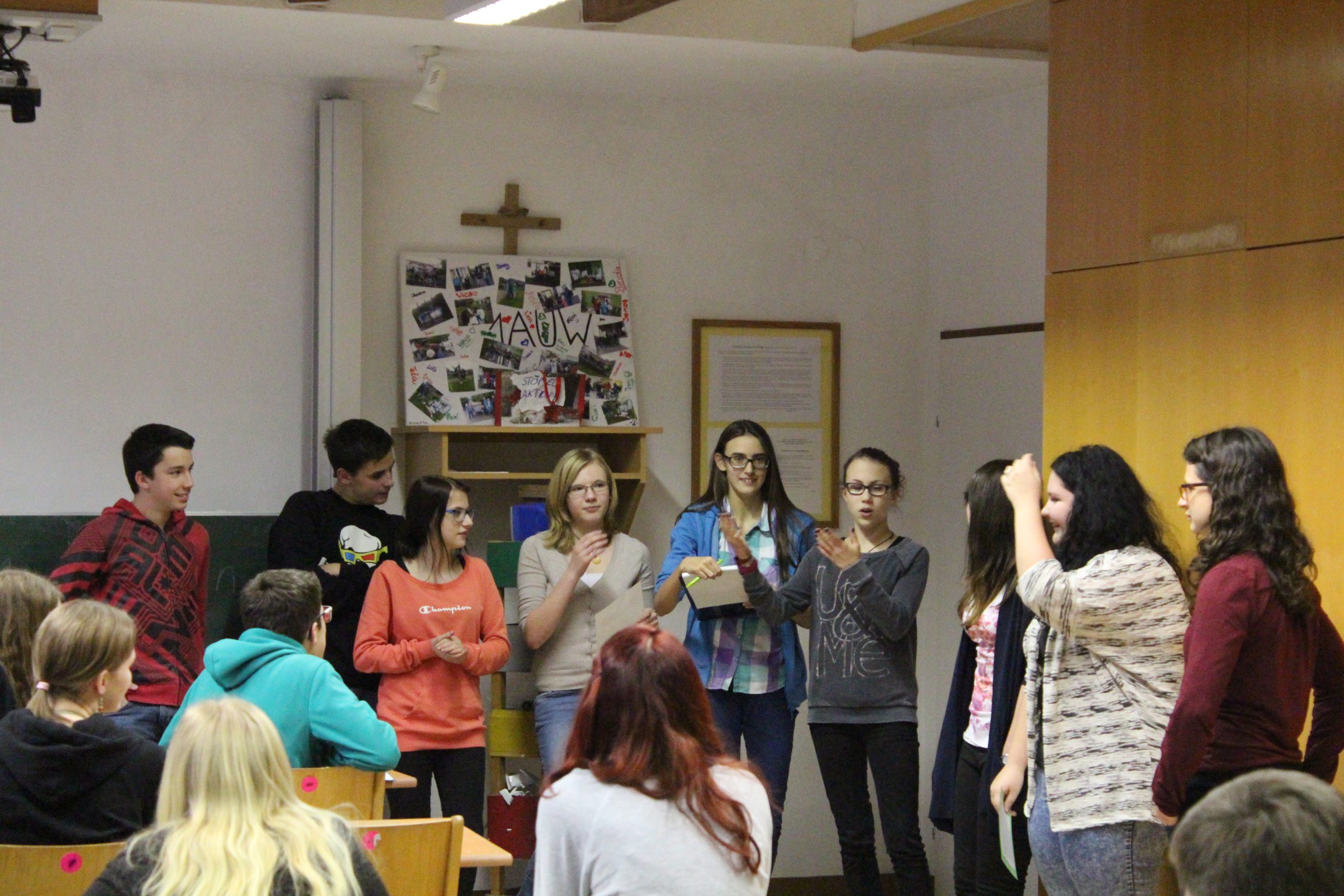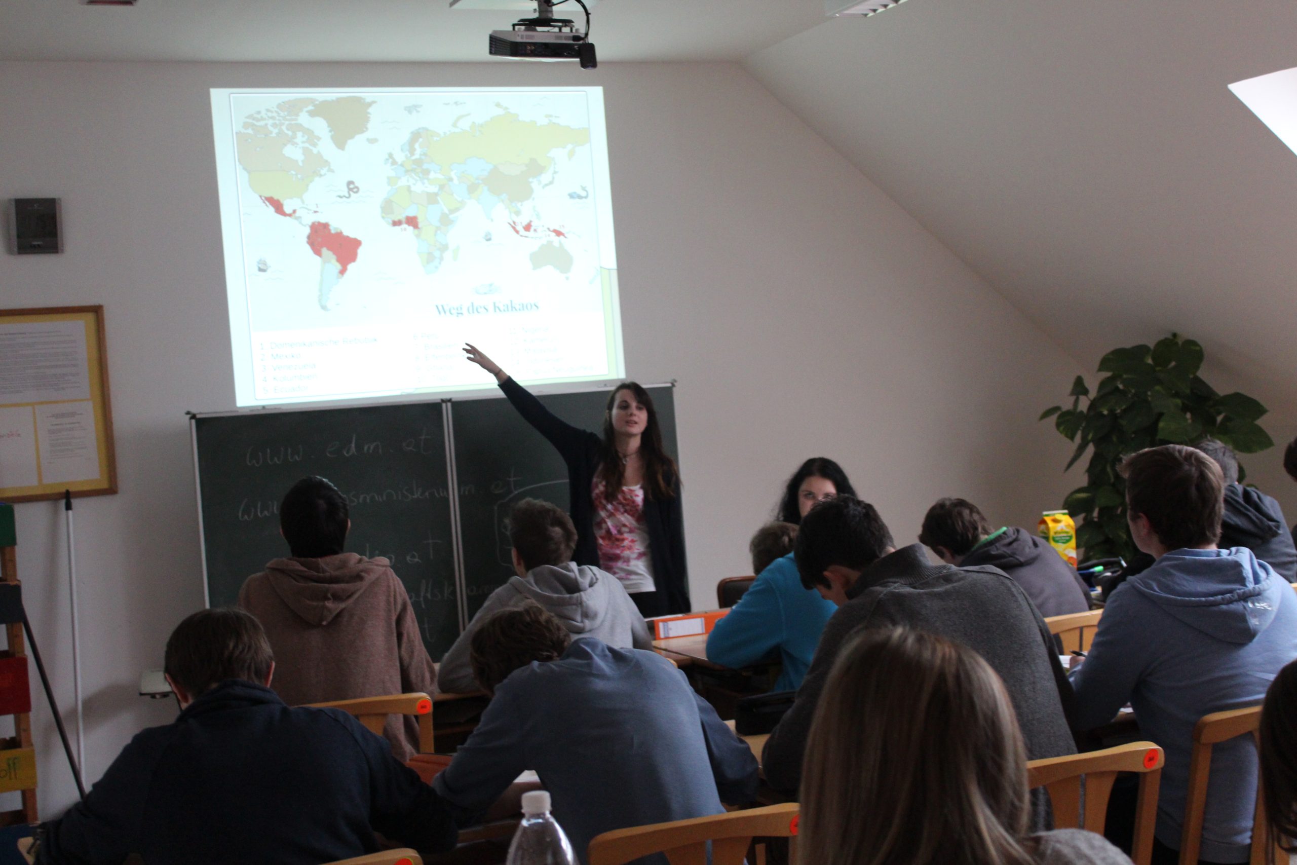 Zu Beginn des Unterrichts haben wir den Schülern und Schülerinnen das Projekt „Fair Trade School“ vorgestellt. Anschließend zweigten wir ihnen ein kurzes Video, welches erklärt, was Fair Trade eigentlich ist. (https://www.youtube.com/watch?v=koOhiOWAujo) Als Hauptthema der Unterrichtseinheit Geografie wählten wir „Die Herkunft des Kakaos“. Die Schüler und Schülerinnen sollten auf einer Karte eintragen, in welchen Ländern Kakao angebaut wird, der sogenannte Kakaogürtel. Weiters wurde in einem Referat der Verarbeitungsprozess der Kakaobohne gezeigt und auch gemeinsam mit den Schülern erarbeitet. Zu guter Letzt wurde ein Quiz veranstaltet. Dazu stellten wir eine Klingel auf den Lehrertisch und baten die Schülerinnen und Schüler, alle anderen Tische auf die Seite zu räumen. Die Klasse wurde in drei Gruppen aufgeteilt und am hinteren Ende der Klasse platziert. Jeweils einer aus der Gruppe musste nach Fertigstellung der Frage zur Klingel laufen. Jeweils die erste Schülerin/der erste Schüler, welcher die Klingel erreicht hatte, durfte die Frage beantworten und erhielt Punkte für sein Team. Die Gruppe mit den meisten Punkten gewann eine Fair Trade Vollmilchschokolade.