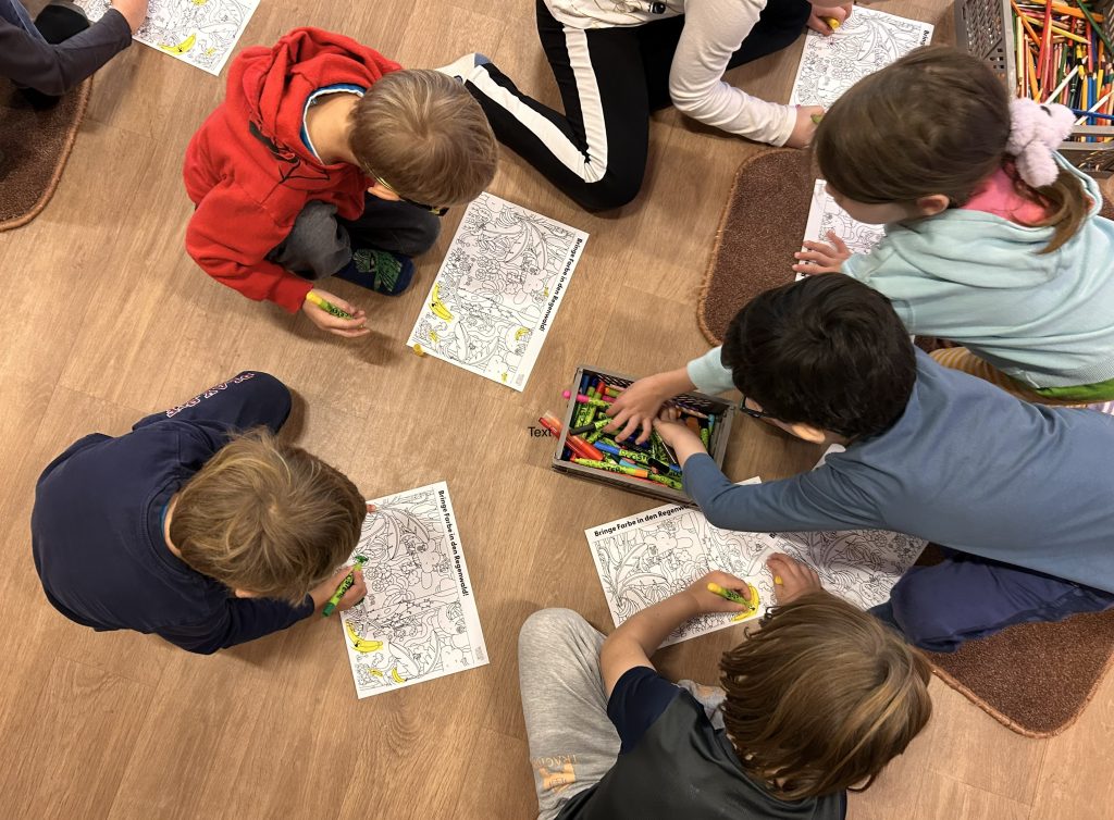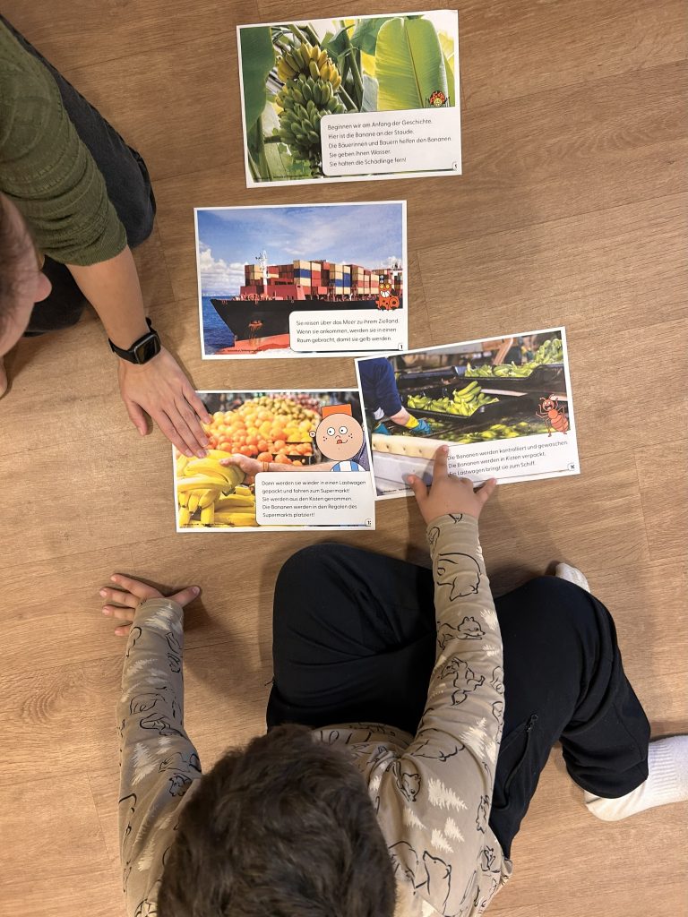 Bevor sich die Kinder ans Basteln einer Wimpelkette für die Aktion machten, sprachen wir gemeinsam über die lange Reise der Banane bis in unsere Supermärkte. Dabei hat uns das Fairtrade-Bildungsmaterial wunderbar unterstützt. Wir machten uns Gedanken über die Arbeitsbedingungen der BäuerInnen und ArbeiterInnen und die Kinder sind sich einig, dass faire Bezahlung für alle möglich sein muss. Kinderarbeit zu verhindern und Umweltschutz ist ihnen ebenso wichtig, aber sie erzählten uns auch von ganz praktischen Dingen in Zusammenhang mit Bananen: