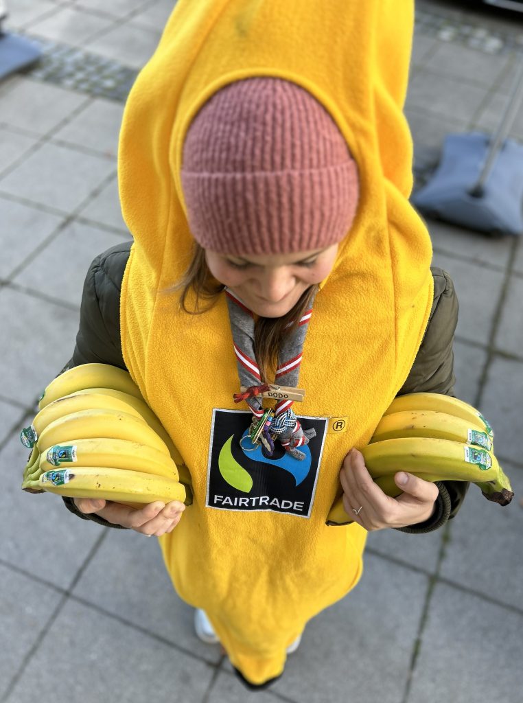Ausgerüstet mit den Fairtrade-Bananen-Kostümen, gebastelten Wimpelketten und guter Laune verteilten die Pfadfinderinnen und Pfadfinder der Gruppe Laa an der Thaya rund 90 Kilo Bananen an Passantinnen und Passanten.